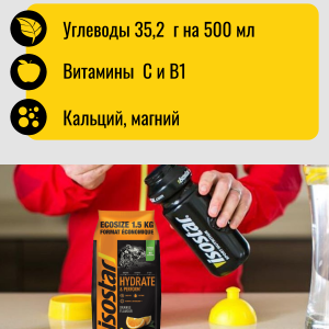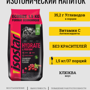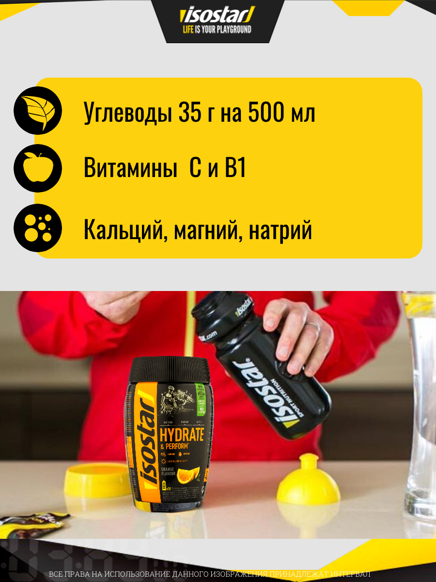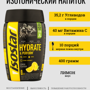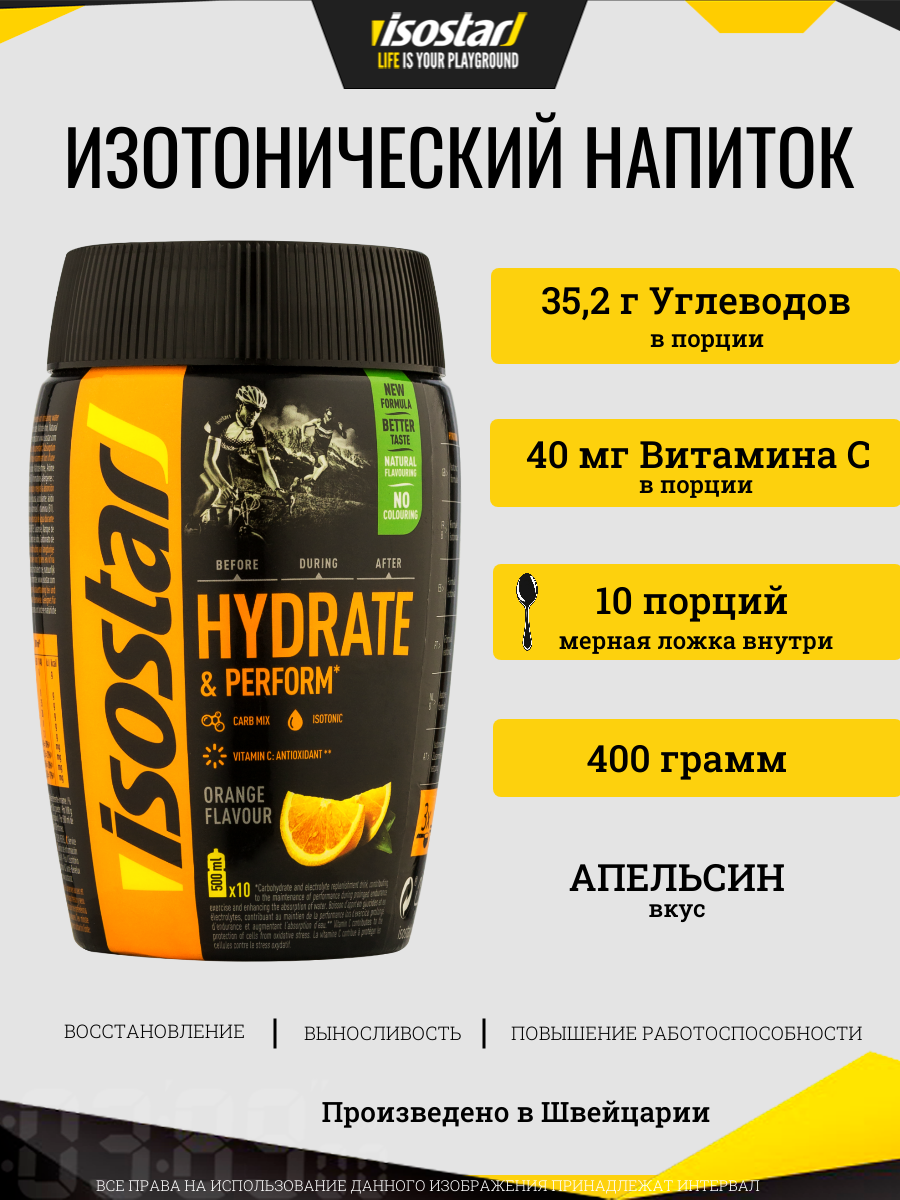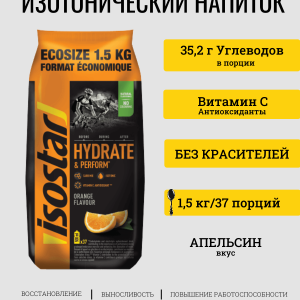 Isostar Hydrate & Perform – изотонический апельсиновый напиток с апельсиновым вкусом – это углеводный и электролитный напиток, обеспечивающий спортсмену необходимое количество жидкости и энергии до и во время тренировки. Специальная изотоническая формула спортивного напитка обеспечивает более быстрое всасывание жидкости в организме. Питье перед тренировкой обеспечит вас необходимым запасом жидкости. Потребление жидкости во время упражнений поможет улучшить работоспособность и выносливость за счет снижения риска желудочно-кишечных проблем. Применение продукта после загрузки обеспечит лучший процесс восстановления.