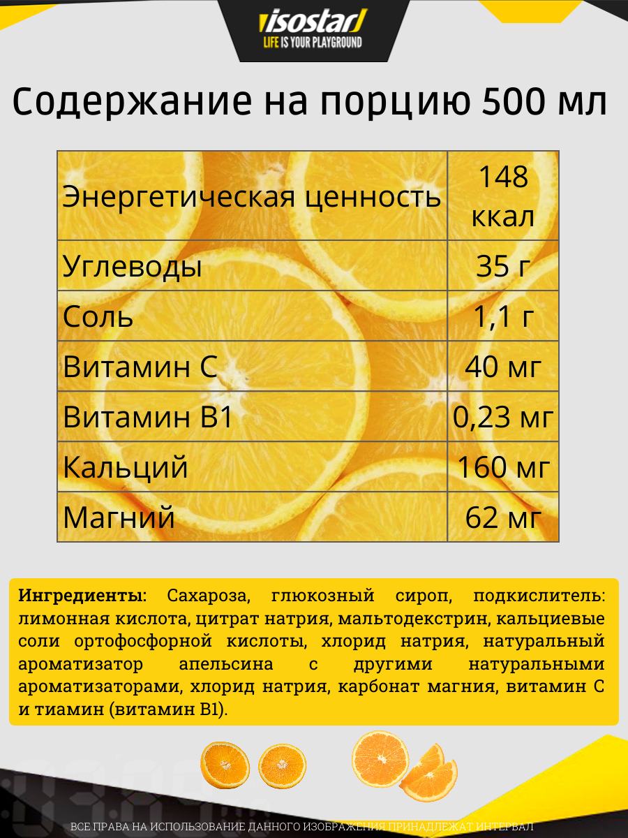 Isostar Hydrate & Perform Orange – отличный источник витаминов и микроэлементов. Кальций и магний – обеспечивает функции мышц во время тренировок и восстановления. Его антиоксидант, витамин С и цинк, помогает защитить клетки от окислительного стресса, возникающего во время жизнедеятельности организма. Витамин В1 помогает обеспечить оптимальный энергетический обмен или преобразование питательных веществ в энергию. Электролит натрия помогает восстановить запасы жидкости после потоотделения во время тренировки. Новая, проверенная и контролируемая формула.